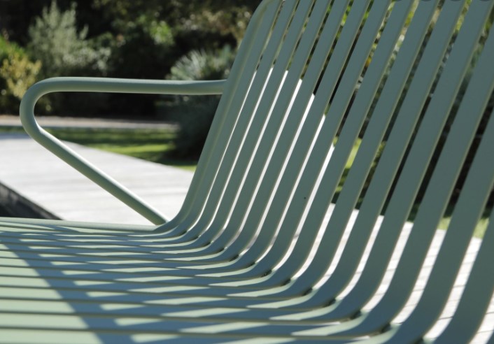 Powder coated aluminium Olefin fabric Rounded, curved backs with tapered legs, thick, deep cushions