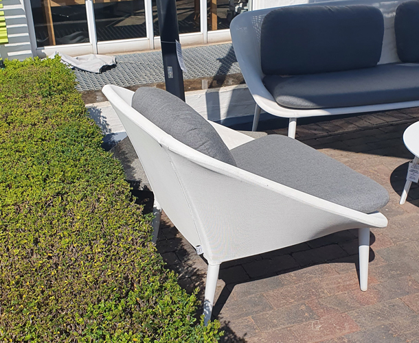 Powder-coated aluminium. Sling all-weather textile. Solution-dyed fabric. Quick dry foam. 3 Seat cushions, 4 back cushions. Monstera fabric. 4 x scatter cushions. 2 x 1 Seater, 1 x 3-Seater Sofa